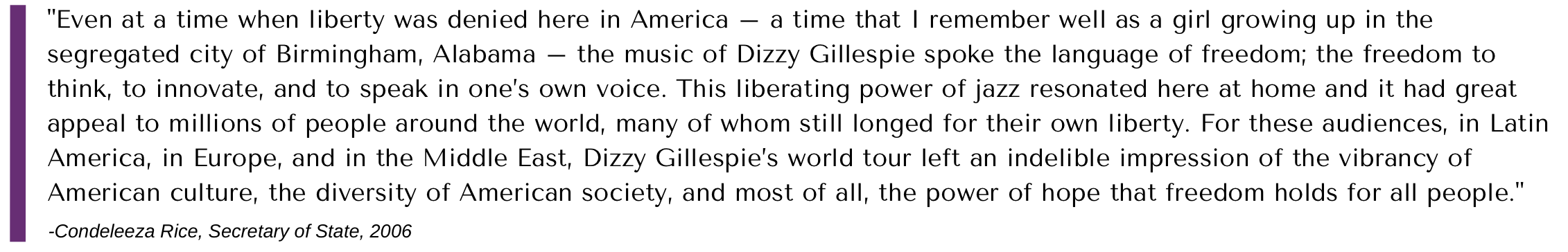 The tours exemplified the power of music to cross frontiers and share American ideas abroad. The federal government recognized the value of jazz as an American music form for the first time through its promotion, and jazz continued to play an important role in the Civil Rights movement.