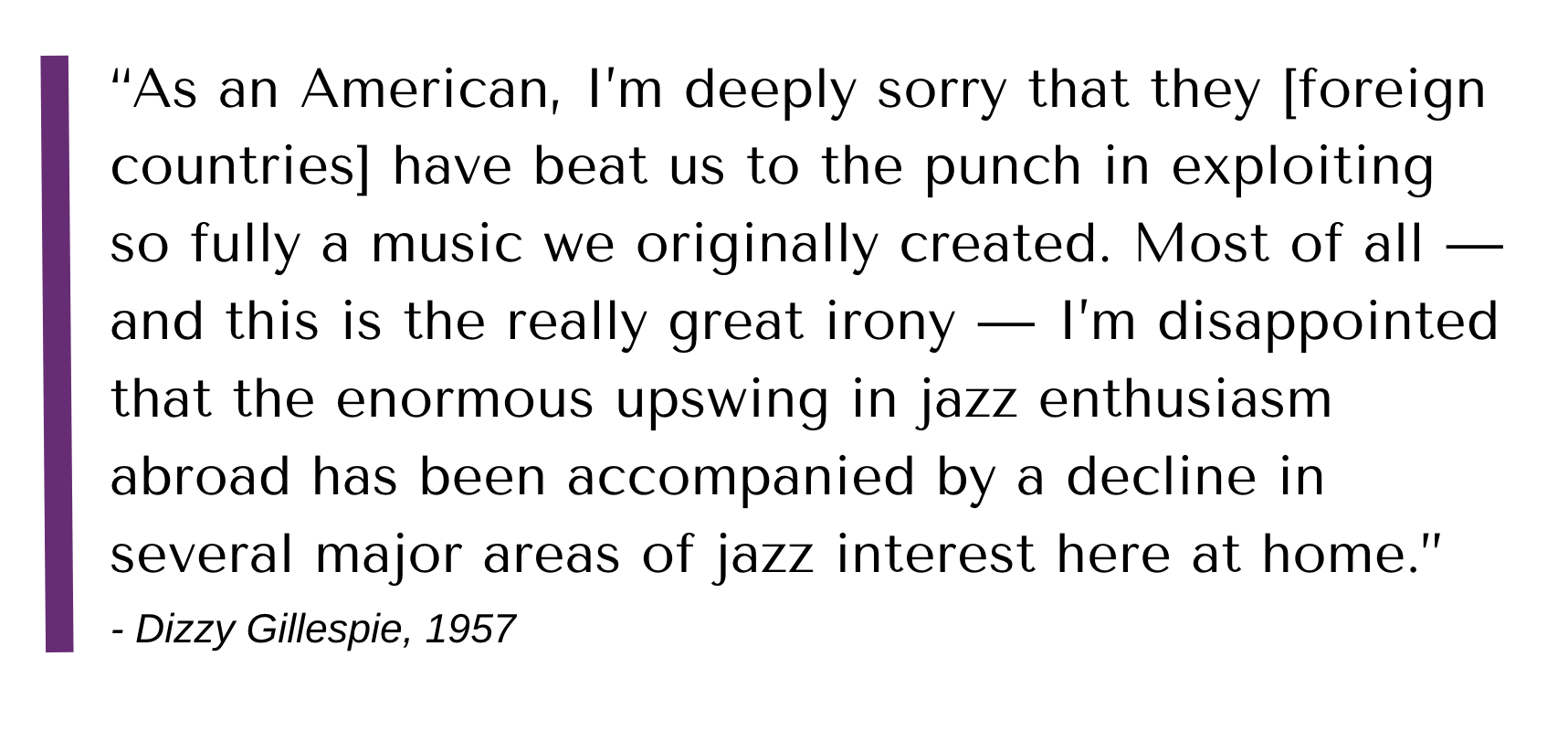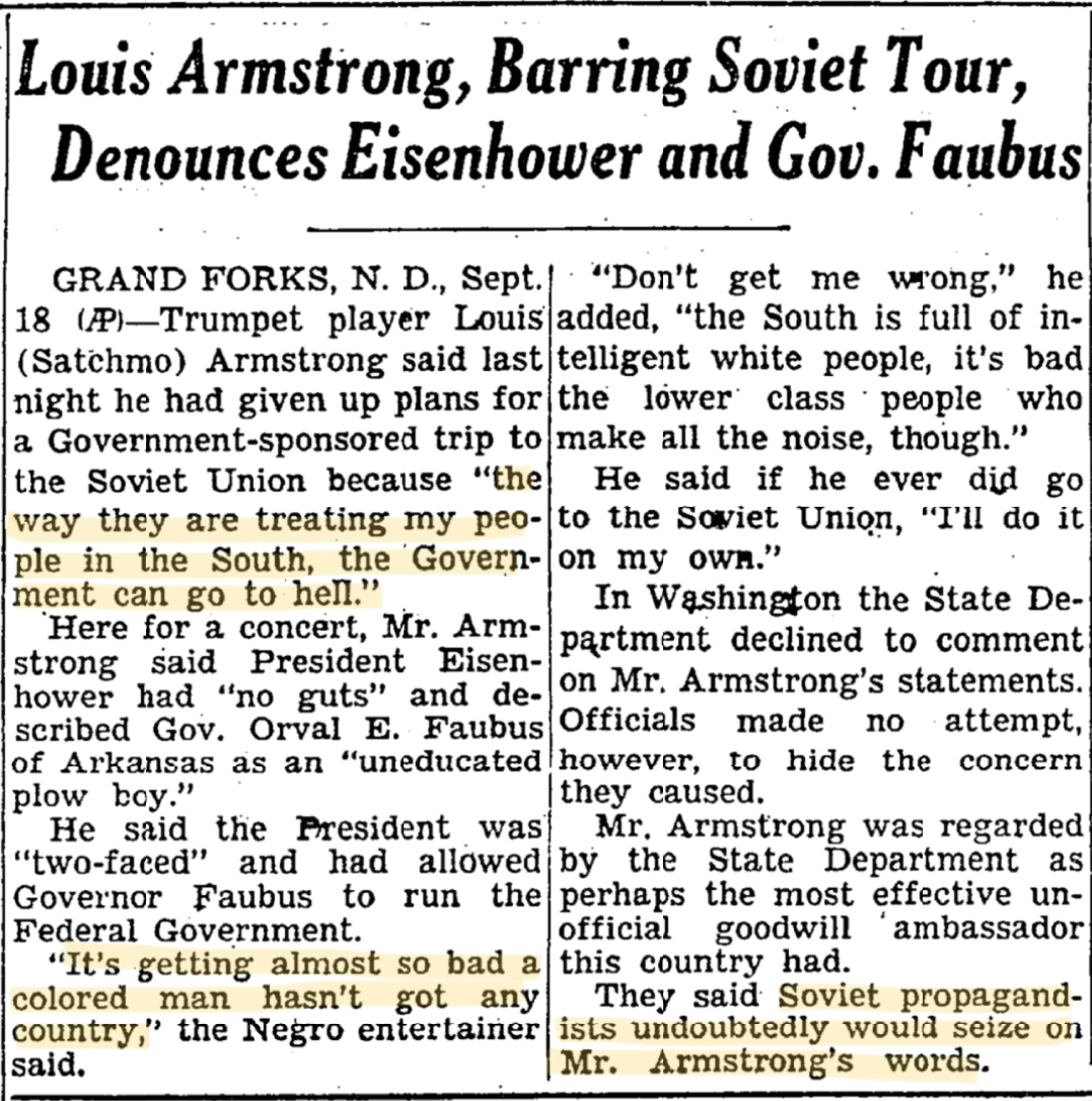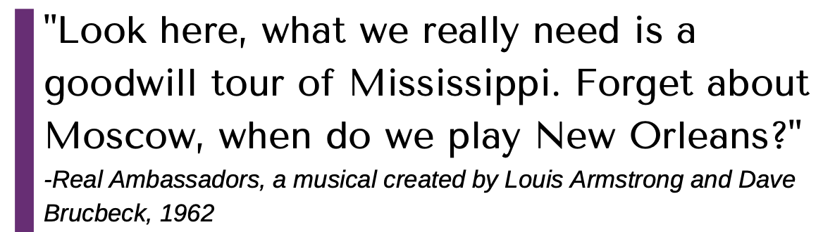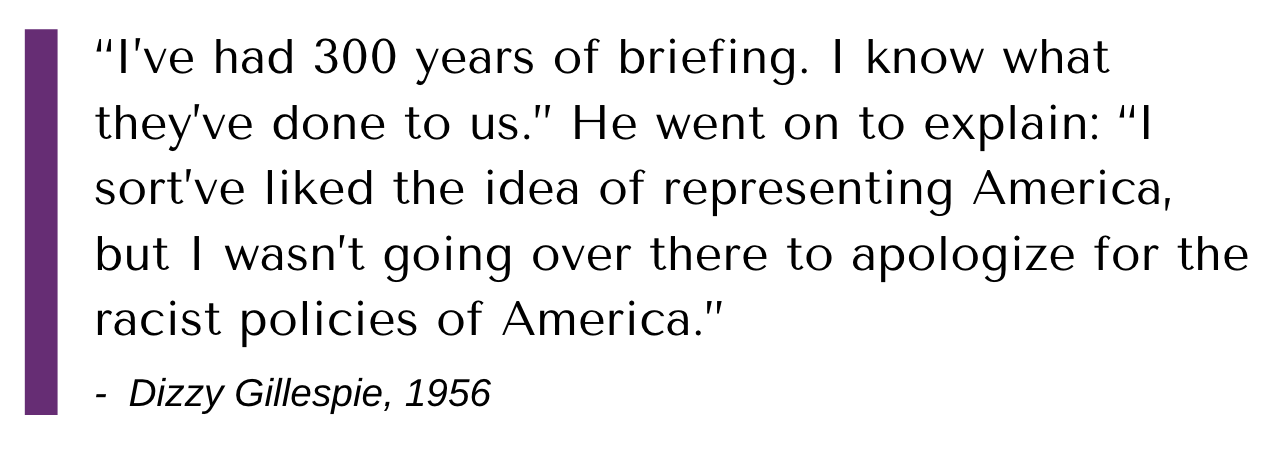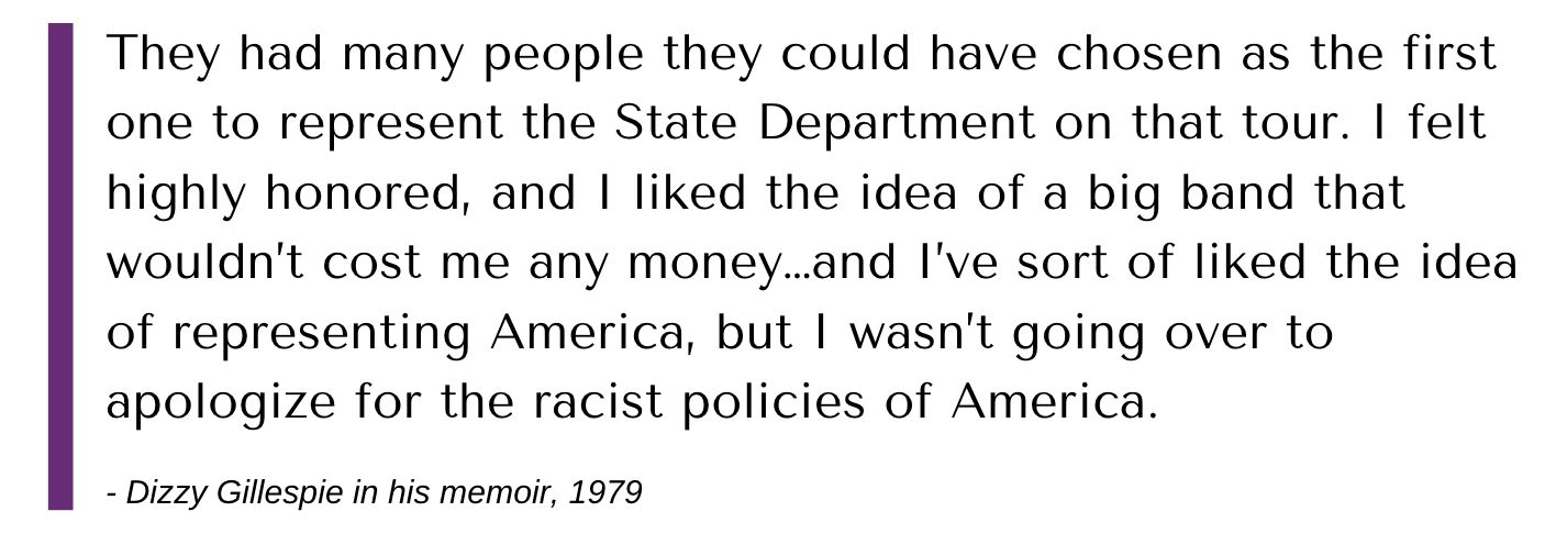 Yet African-American musicians were intimately aware of the hypocrisy of being sent to counter images of racism in America. The very same interracial bands which achieved success abroad could not perform in the Jim Crow South.