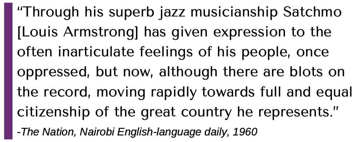 And at home, the tours crossed racial frontiers as African-American musicians served as official representatives of the state while promoting an art from closely associated with black culture. The musicians wielded the soft power of the tours to spread optimism and instill black pride and respectability.