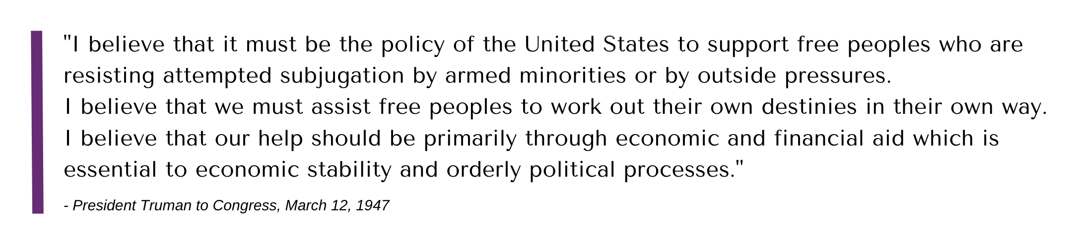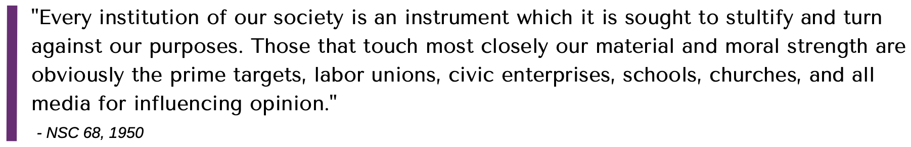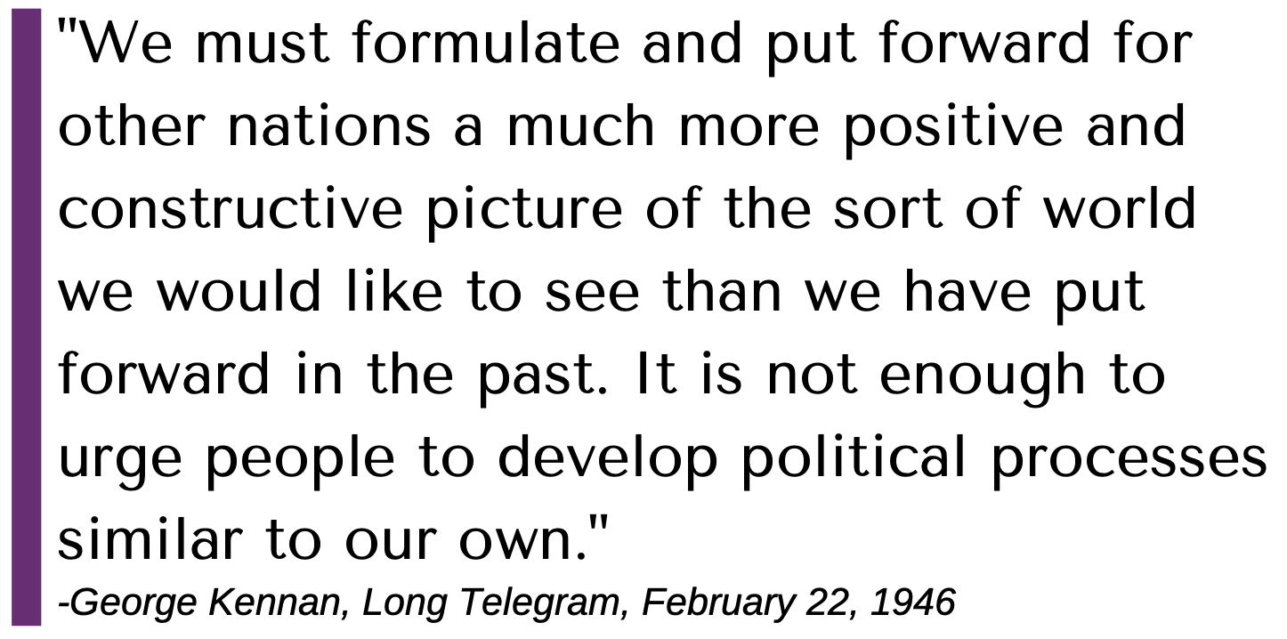 The Cold War ultimately became one that harnessed all resources of the United States: military, cultural, and ideological; the US adopted a policy of containment - or preventing the spread of communism.